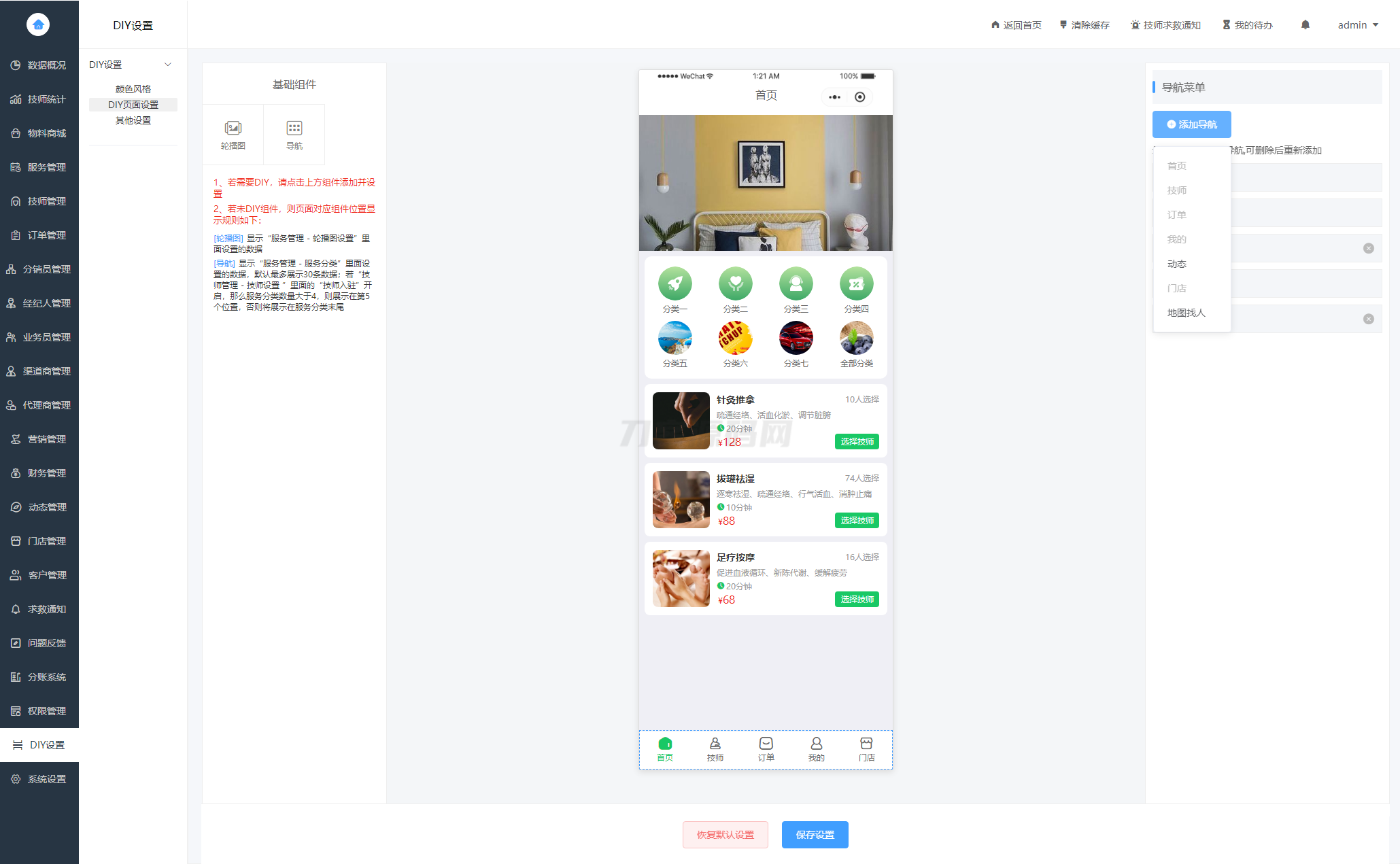 16、DIY设置( DIY页面设置,用户可以自由排版,任选链接页面或加减底部菜单 )
