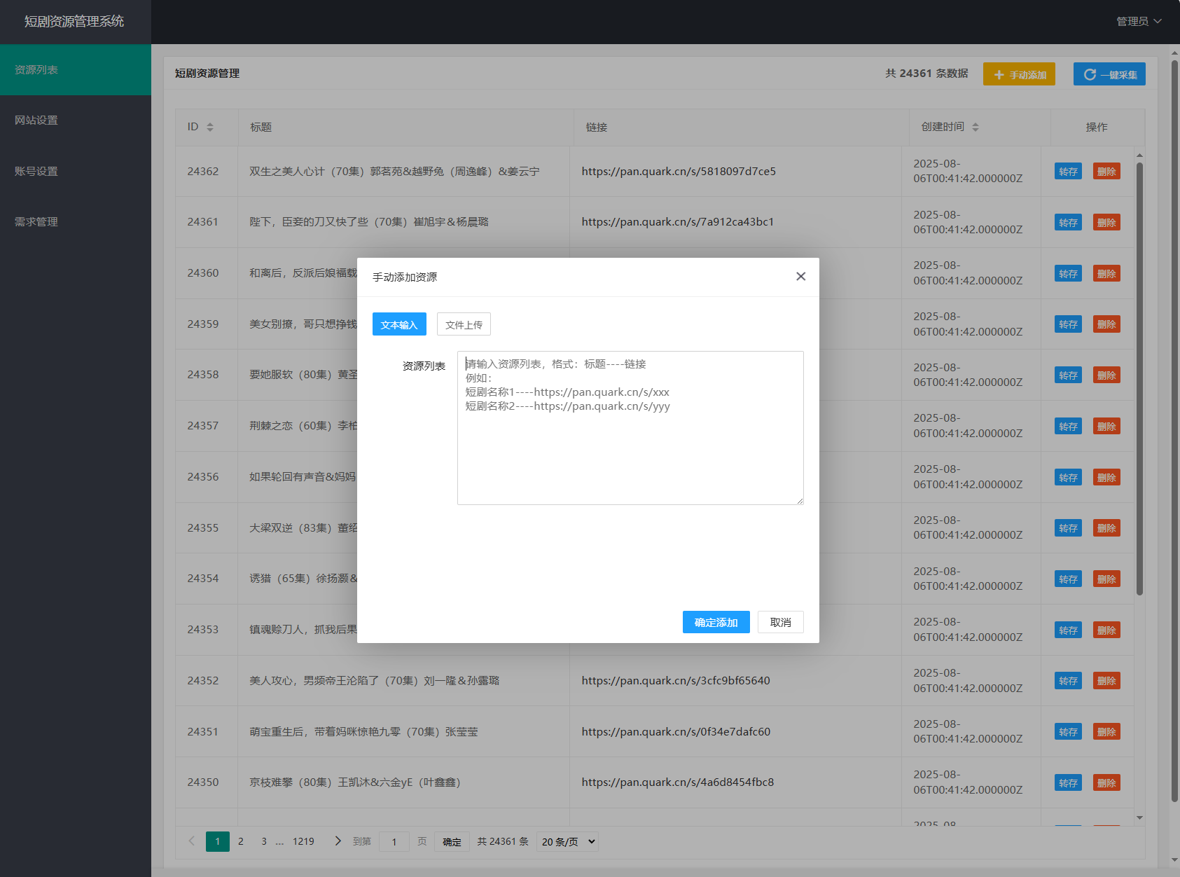网盘短剧资源转存项目源码 支持夸克 带后台 附教程admin前天更新关注私信085网盘短剧资源转存项目源码 支持夸克 带后台 附教程此内容为免费阅读,请登录后查看¥0 登录查看免费阅读已售 5 简介: 网盘短剧资源转存项目源码 支持夸克 带后台 附教程 安装教程: 测试环境:Nginx + PHP7.4 + MySQL5.7 数据库信息配置文件:.env 网站运行目录设置为:public 图片: 课程下载: 此处内容已隐藏,年度会员可见 请登录后查看特权 © 版权声明文章版权归作者所有,未经允许请勿转载。THE END网站源码 喜欢就支持一下吧点赞5 分享QQ空间微博QQ好友海报分享复制链接收藏